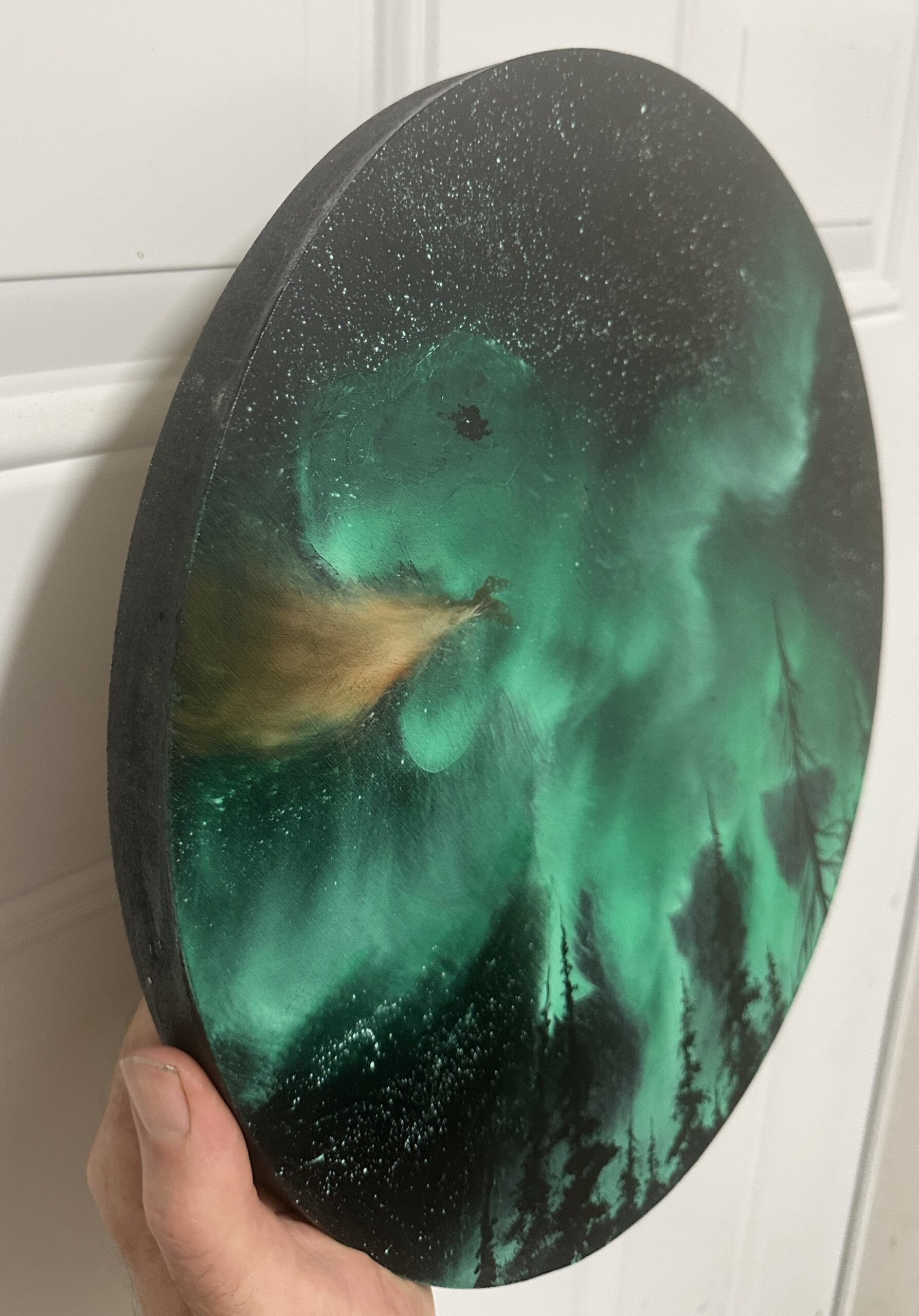This is an original 14" diameter oil painting that I painted on a cradled wooden panel. It comes painted black around the edges as shown in the second photo, so does not require framing. This painting also comes with a signed certificate of authenticity.